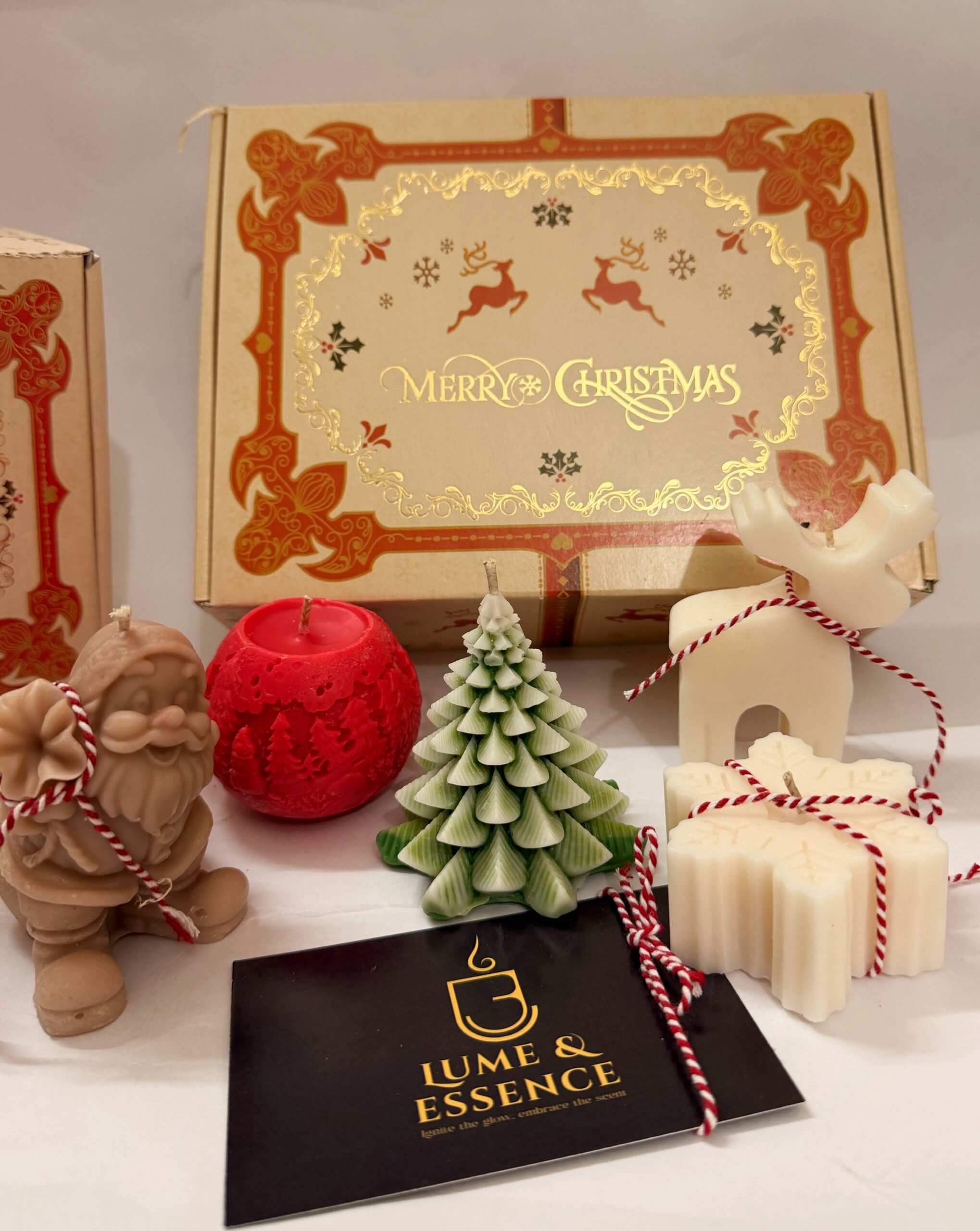 A magical curation of five festive candles nestled inside a luxurious hamper box — each one inspired by a cherished symbol of Christmas. Hand-poured, beautifully detailed, and wrapped in holiday warmth, this box is designed to fill every corner with joy, coziness, and winter sparkle.